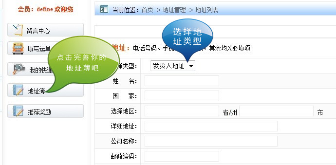 1,用戶登錄進入到會員中心之后,在左側(cè)的導(dǎo)航欄點擊“我的地址薄”,就可以添加自己常用的發(fā)貨地址和收貨地址信息: